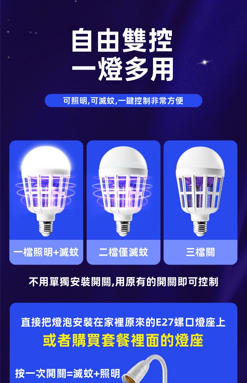 7分鐘前限時搶購 LED照明滅蚊燈E27螺口一擰即裝,UV紫光誘蚊,節能LED無頻閃,護眼超安全,居家戶外兩相宜 - 3入組-【均價399】NT$1199